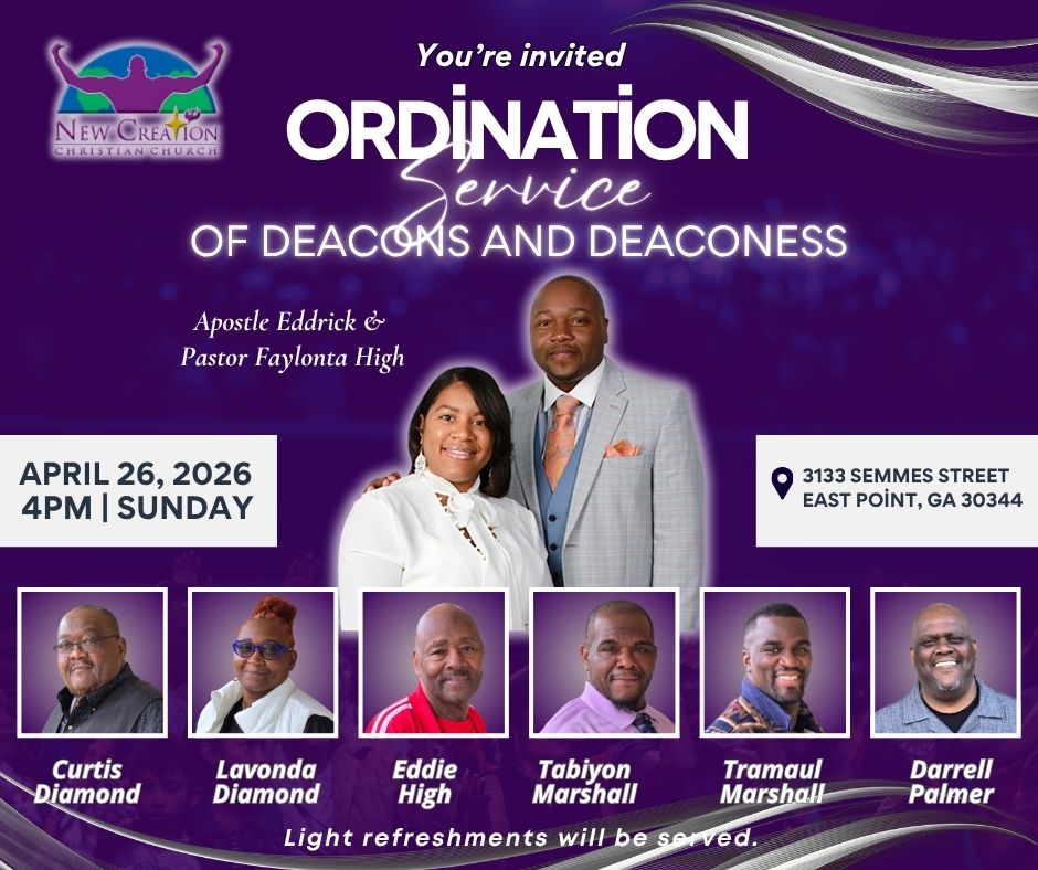 This is a wonderful opportunity for us to grow in our faith and celebrate those who have answered the call to serve. On April 26, 2026, we invite the entire New Creation Christian Church family and the community to join Apostle Eddrick and Pastor Faylonta High as we officially ordain our new Deacons and Deaconess.